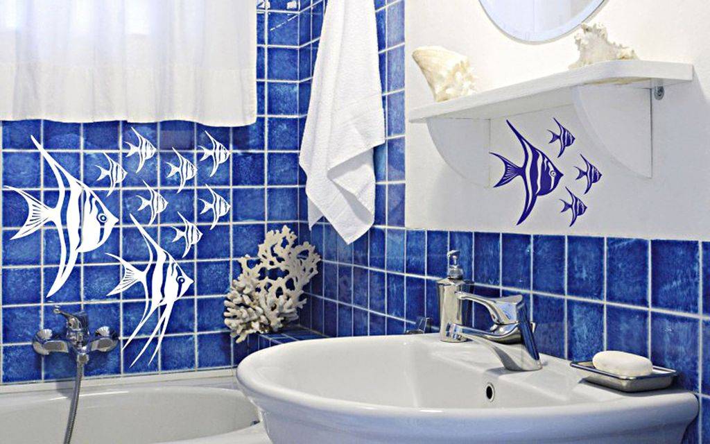 - Морская тематика — пожалуй, самая популярная. На виниловых стикерах изображаются бушующие волны, ракушки, водоросли, обитатели моря (рыбы, морские звезды, кораллы). Как вариант, можно приклеить изображение кораблика или парусника, который прекрасно впишется в интерьер любой ванной комнаты.