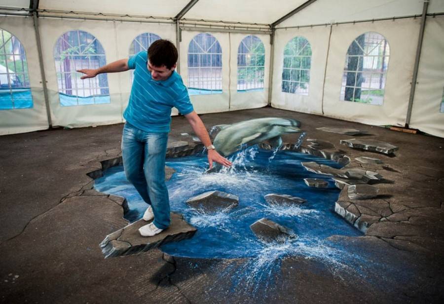 Такие картины выглядят трехмерными и настоящими, если на них посмотреть с определенного ракурса. На сегодняшний день, этот стиль применяют и в декоре полов.