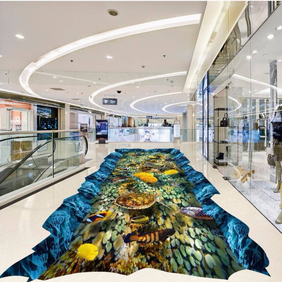 Покрытия с трёхмерным эффектом, используемые внутри дома кардинально отличаются от уличной графики. Они представляют собой многослойную конструкцию из самозастывающих полимеров – подобие «сэндвича», внутри которого находится рисунок, создающий ощущение уходящего вглубь пространства.