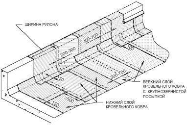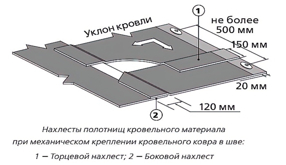 Герметичность кровельного ковра обеспечивается за счет качественно выполненных нахлестов. Смежные полотнища укладываются с боковым нахлестом от 8 см, и торцевым от 15 см. Стыки выполняются с учетом направления уклона кровли, чтобы под них не подтекала влага.