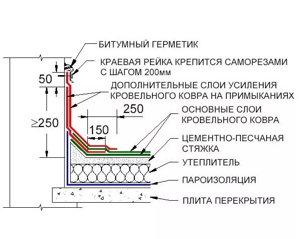 Чтобы обустроить примыкание к парапету, нижний слой ковра заводится на высоту от 250 мм и крепится механическим способом. Затем на парапет заводится финишный слой ковра (на 5 см). Поверх готовой конструкции, используя инструменты для наплавляемой кровли, монтируется лента из покрытия с защитной посыпкой, которая обеспечивает герметичность примыкания. В первую очередь, наклеивается ее верхняя часть на вертикальную плоскость, затем нижняя – на горизонтальную.