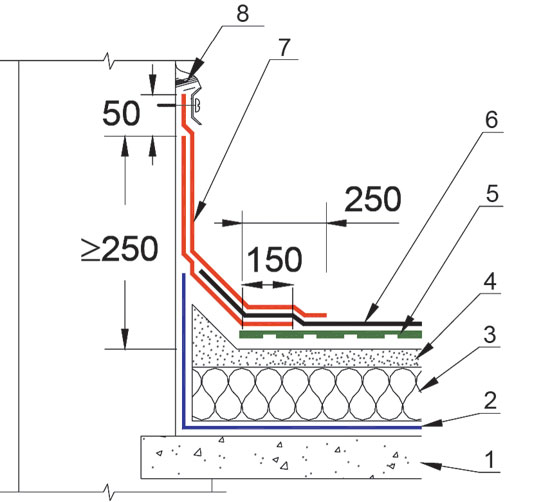 Температурно-усадочные швы стяжки рекомендуется закрывать рулонным материалом с крупнозернистой посыпкой, причем ленты укладываются посыпкой вниз. Вокруг водоприемных воронок необходимо уложить дополнительный слой гидроизоляции – квадраты размером 70×70 см.