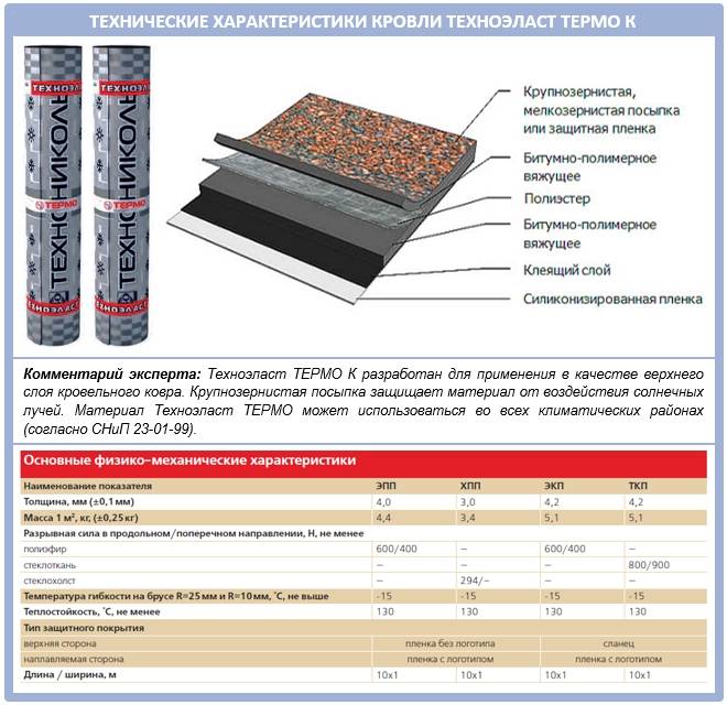 | Техноэласт | Полиэфирная основа, битум, полимеры, бутадиен-стирольный термоэластопласт и наполнитель, сланцевая посыпка | Устройства финишного покрытия для кровли с повышенными требованиями |