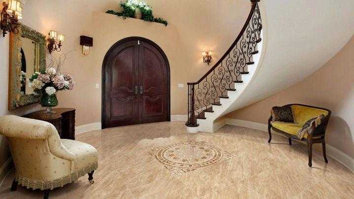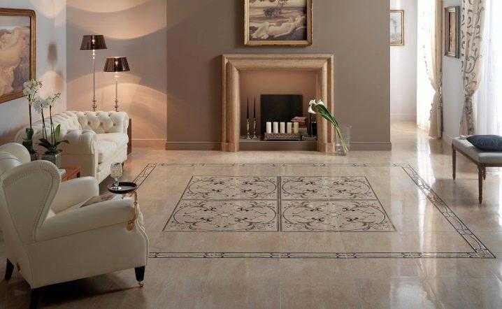 В классическом интерьере особенно красиво смотрится плитка «под мрамор». Здесь уместны и роскошные тяжелые шторы, и картины, и люстры в стиле канделябров. Интересно смотрятся на полу плиточные композиции с разнообразными узорами. Такой принт может вполне заменить ковер, сделав пол полноценным декоративным элементом.