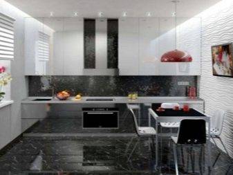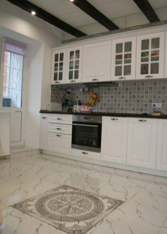 Плитка, в отличие от ламинированного покрытия, не боится влаги, долговечна, частая уборка и пролитая жидкость ей не страшны. Поэтому при создании комбинированного пола, ее используют в зоне готовки, а ламели оставляют для зоны отдыха. При небольших размерах зоны готовки предпочтительнее, если покрытия будут сочетаться по цвету. Контрастные тона утяжелят и уменьшат помещение визуально.