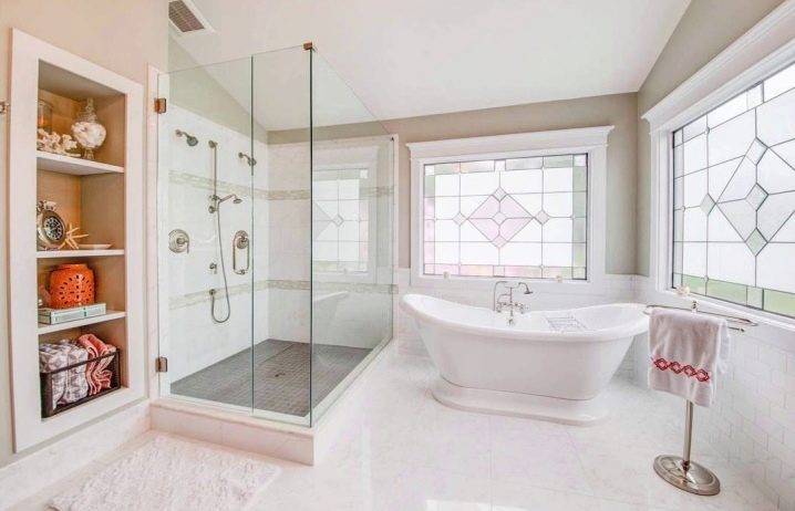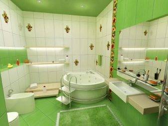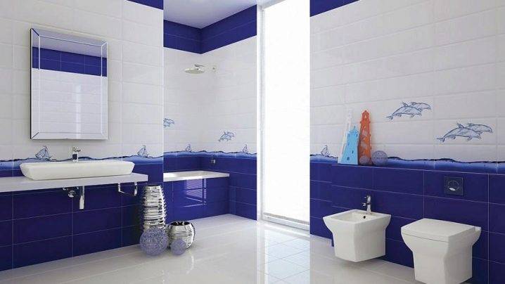 Нейтральный цвет позволяет создавать эффектные сочетания с плиткой на стенах. Это может быть двухцветная комбинация или же красочное панно. Особенно красиво в ванной смотрятся бело-голубые композиции, связанные с морской тематикой.
