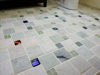 Можно выложить пол одинаковой однотонной плиткой или рассмотреть более интересные варианты. Для малометражных помещений рекомендуется выкладывать пол однотонной глянцевой светлой плиткой: так вы сможете визуально расширить пространство. Если у вас просторная ванная комната, гостиная, кухня или прихожая, можно продумать более интересные варианты дизайна. Например, можно комбинировать такую отделку с контрастными вставками, обрамлять бордюрами.