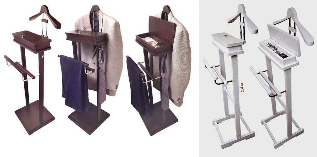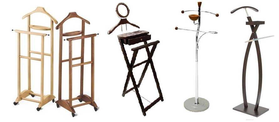 Бывают стойки для костюма из древесины, металла и пластика. Пластик в данном случае неплох: нагрузки большой не предвидится, так что прочности современных пластмасс более чем достаточно.