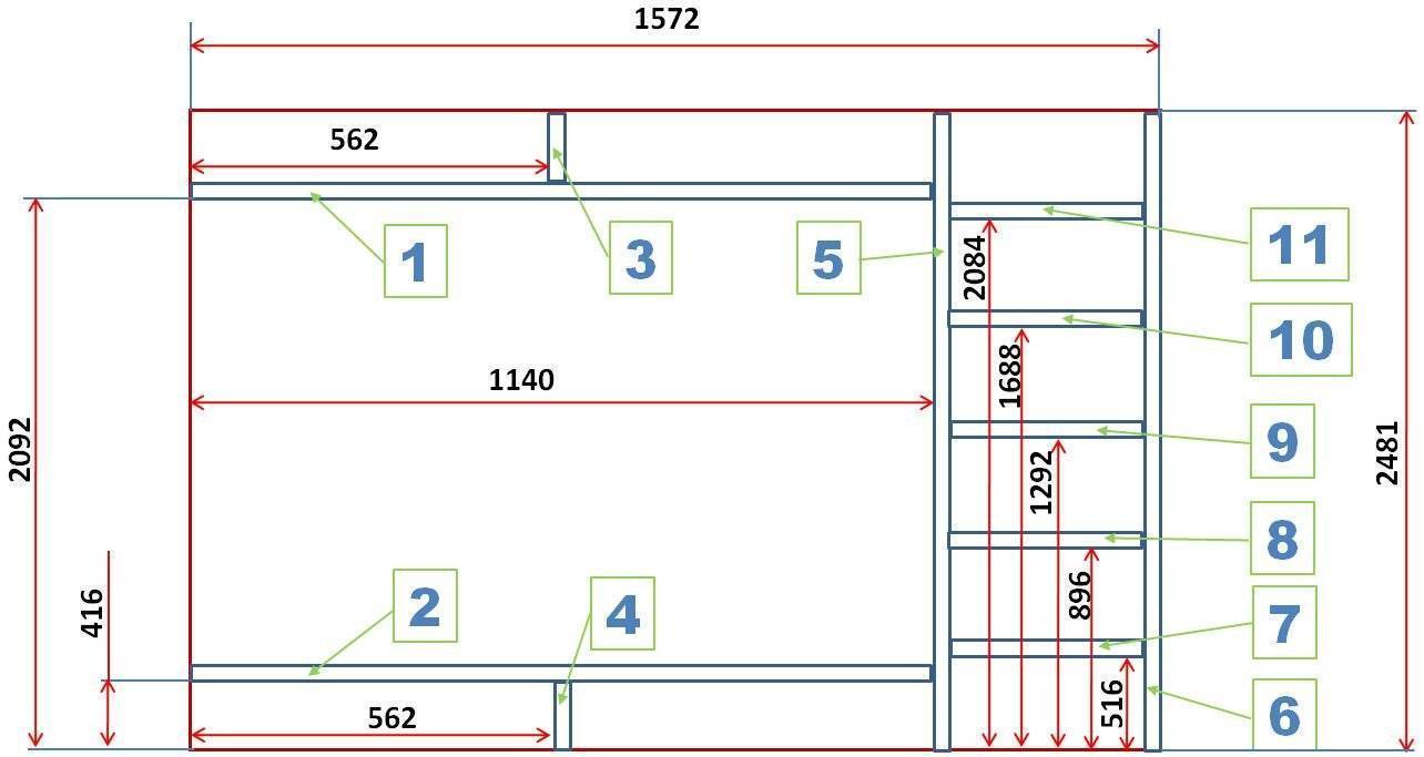 Здесь будет рассмотрен процесс изготовления шкафа глубиной 520 мм, высотой 2 480 мм и шириной 1572 мм (рассчитывается по правилу «золотого сечения» с учётом высоты 2 480/1,62=1 531).