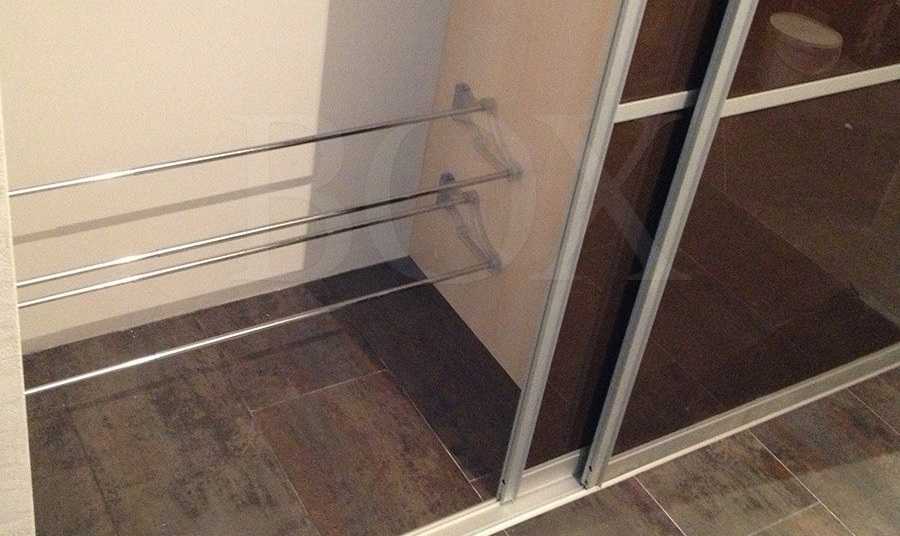 При ширине шкафа купе 45 см и менее, надо искать выдвижную конструкцию — поперечные (фронтальные) штанги, на которых вешалки висят параллельно двери, а не боком к ней. Подобные конструкции крепятся чуть выше уровня головы — так удобнее. Вам надо поднять руку и повесить вешалку. Потому примерно на этом уровне крепится полка, а к ней уже штанга.