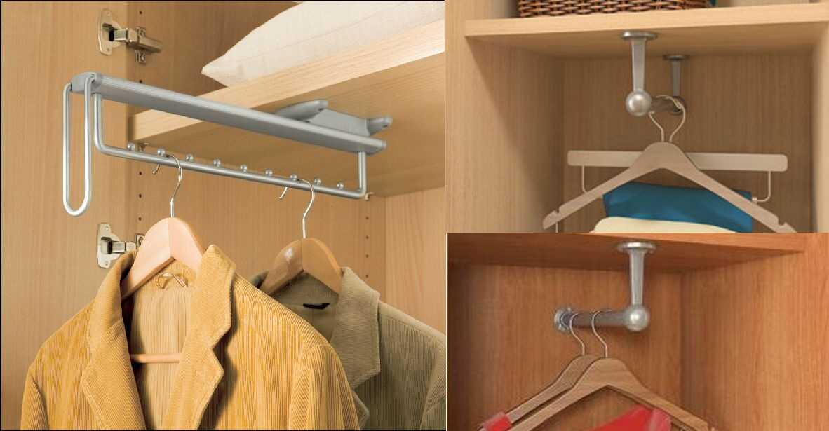 Для шкафов-купе длиной от 1000 мм и полезной глубиной корпуса всего 360 мм для удобства доставания одежды с высоты сегодня рекомендуется использование полностью или частично выдвижной перпендикулярной вешалки, оснащенной телескопической направляющей, удобной ручкой захвата и прочной трубчатой штангой с разделителями, на которой каждый предмет гардероба останется на своем месте.