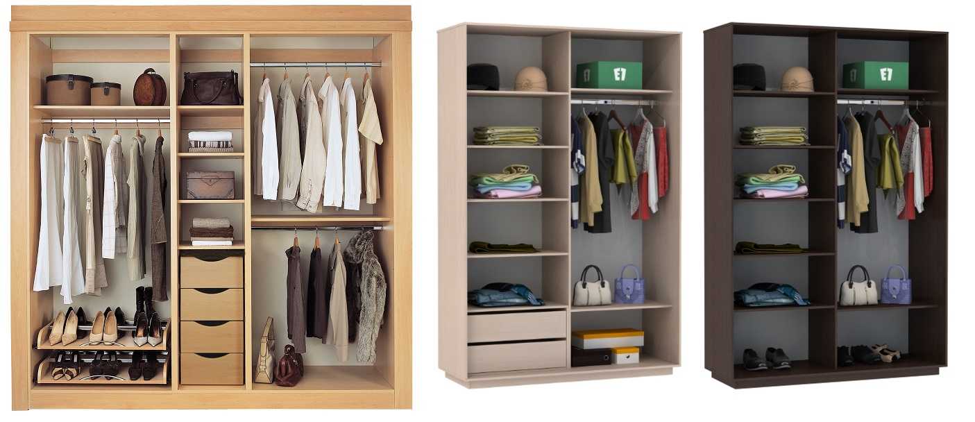 Внутреннее наполнение шкафов не имеет стандартных схем. Все зависит от потребностей хозяев, размеров шифоньера, его конфигурации и места расположения.