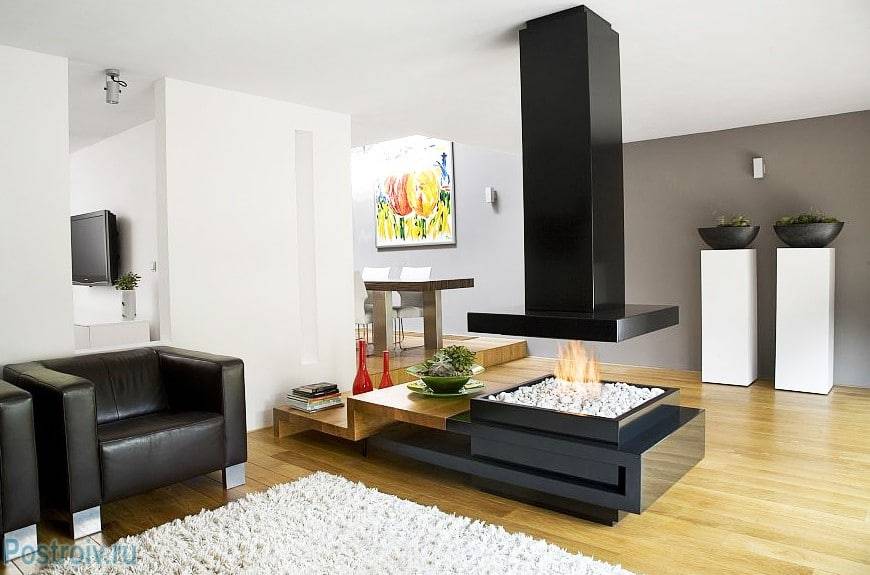 Конструкции очагов подвесного вида выглядят необычно. Часто они снабжены длинным узким дымоходом. Это легкие конструкции, которые крепят к потолку. Поэтому иногда требуется усиление межпотолочного перекрытия. Форма подвесного островного камина может быть каплевидной, цилиндрической или шарообразной.
