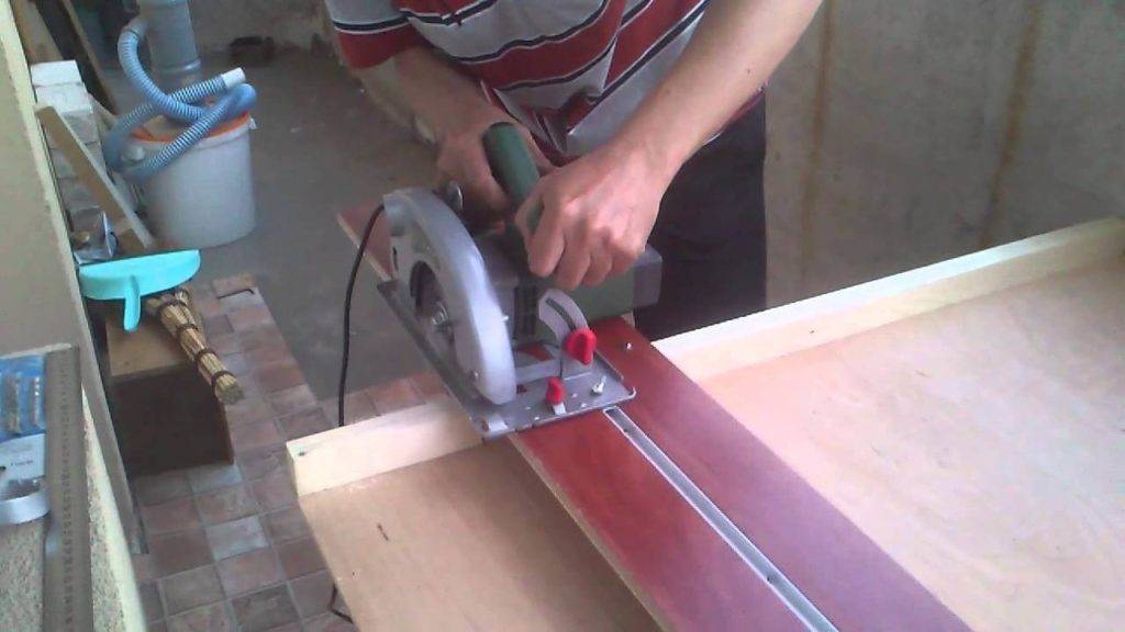 В этом случае маленький профиль инсталлируется в профиль больших размеров. Созданная конструкция прикрепляется к основанию циркулярной пилы. Такой монтаж обеспечивает возможность двигаться точно по заданной линии. Край в основании должен быть безупречно ровным, он обеспечивает качество реза. Профили образуют рельсы, это позволяет заметно снизить прилагаемые усилия, которые необходимы для управления агрегатом. Меньший профиль не должен иметь зазоров с большим профилем, но при этом должно присутствовать свободное движение.