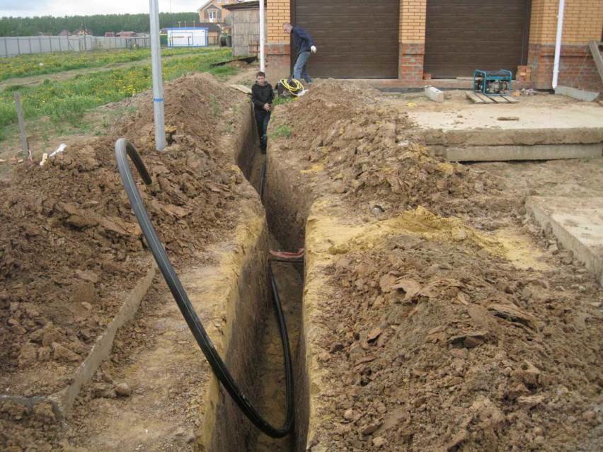 - С помощью специальной техники (траншеекопатели, малогабаритные экскаваторы) или своими руками выкапывается траншея нужной глубины, в которую помещается ПНД трубопровод. После подсыпки песка в траншеи уложенный на песчаную подушку трубопровод закапывают, при небольших глубинах залегания используют кабельный обогрев трубопровода или теплоизоляцию, засыпку не проводящими тепло материалами (керамзит).