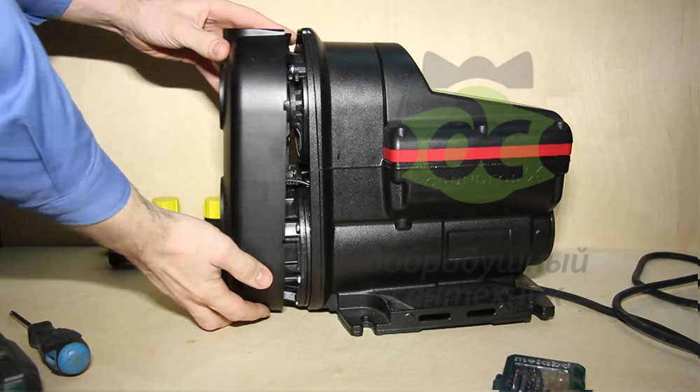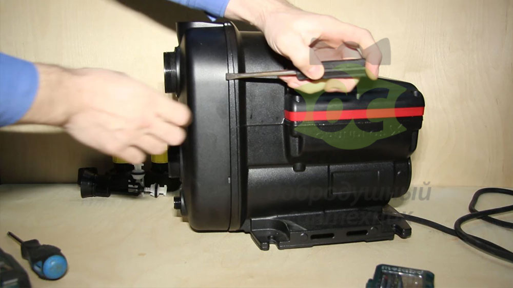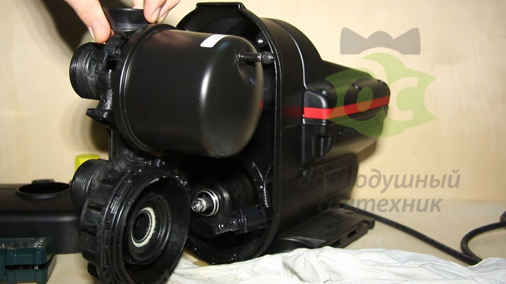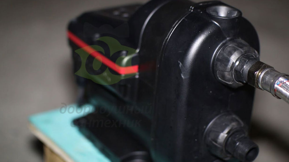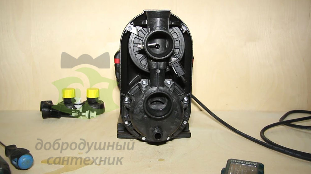 Корпус насоса из алюминия. В верхней части расположен небольшой мембранный бак, который работает здесь как гаситель гидравлических колебаний.