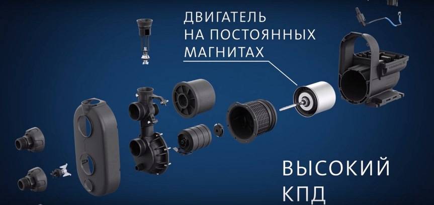 Насосная установка работает по принципу повышения давления воды, движущейся к выходному патрубку от входного. Рабочее колесо, соединенное с ротором через вал, приводится в действие за счет передачи электромагнитной энергии на вращающуюся часть от обмоток статора двигателя. Вода, протекая от входного патрубка агрегата, поступает к центру рабочего колеса, откуда – вдоль его лопаток.