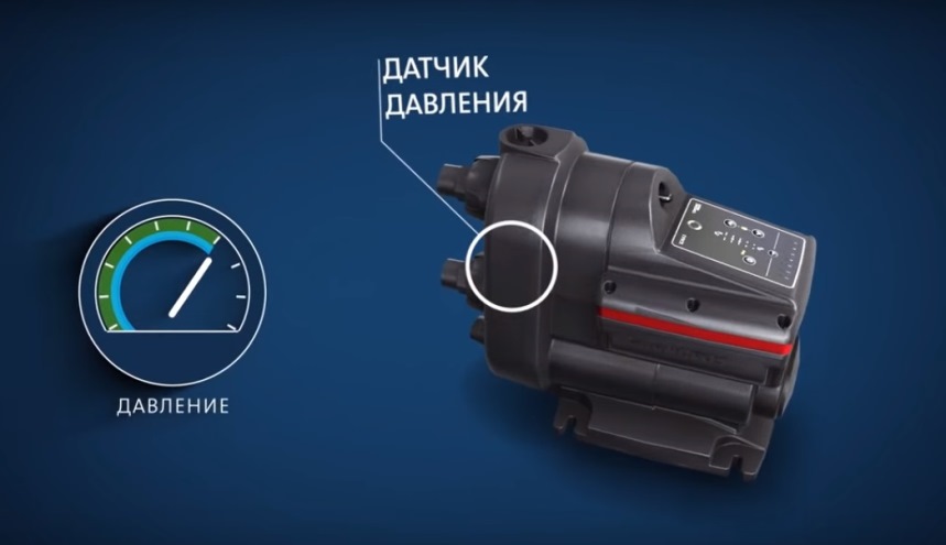 Датчик давления станции отслеживает величину выходного давления агрегата. Если текущее давление отличается от необходимого, он выдает импульс на частотный преобразователь. В результате изменяется скорость вращения электродвигателя. Чтобы адаптировать производительность агрегата к новому состоянию.