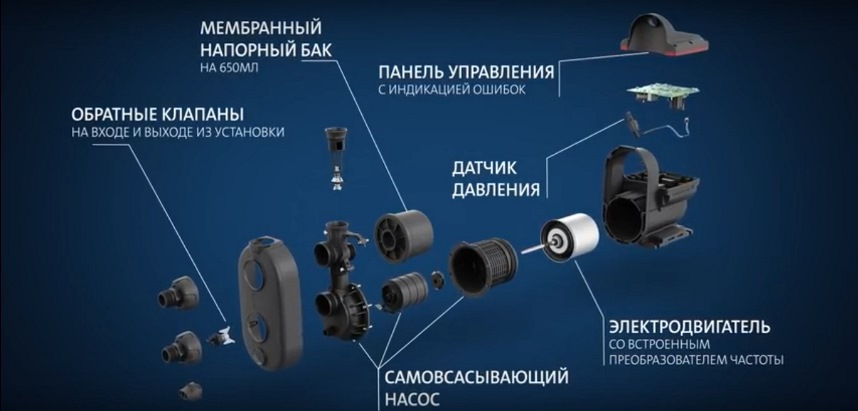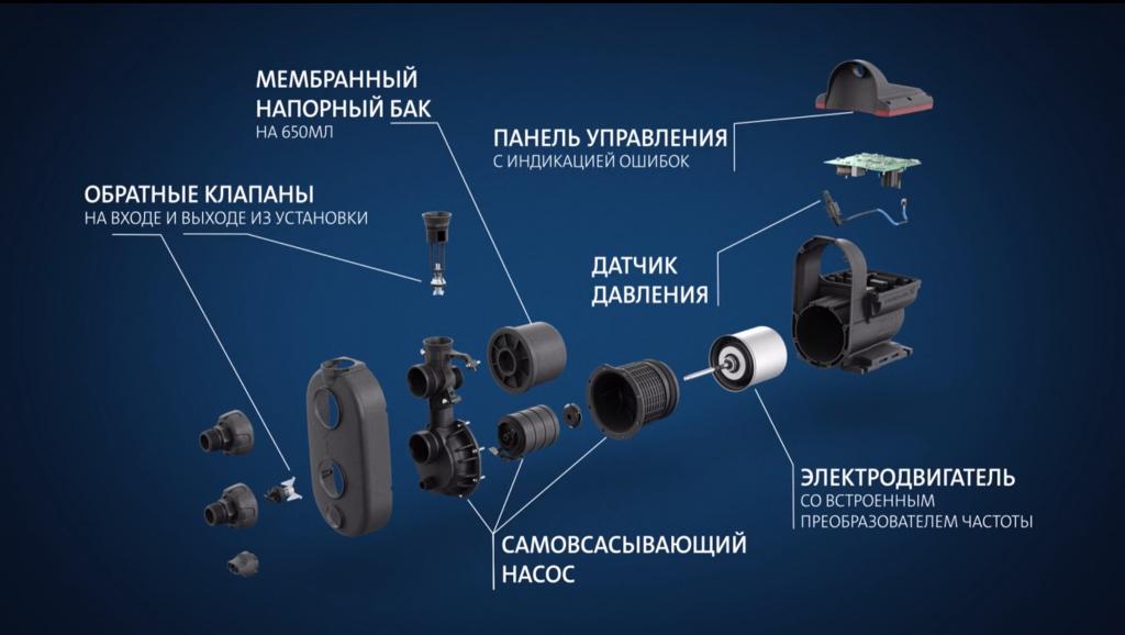 Конструктивными элементами устройства являются: блок управления, корпус из алюминия, граффито-керамическое уплотнение вала, 4-ступенчатые камеры, заливная, сливная пробка, клапаны всасывания и нагнетания, соединительная проставка, всасывающий, напорный патрубок с гибким подключением, входной штуцер, вентиляционные отверстия. Основные узлы – электродвигатель, датчик давления, накопительный бак (650 мл) с ниппелем.