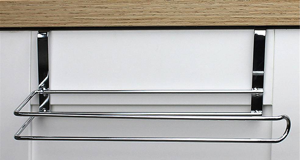 Модель на рейлинге считается многоцелевой, так как помимо хранения рулонных и тканевых полотенец ее используют для хранения фольги, пищевой пленки, бумаги для выпекания.