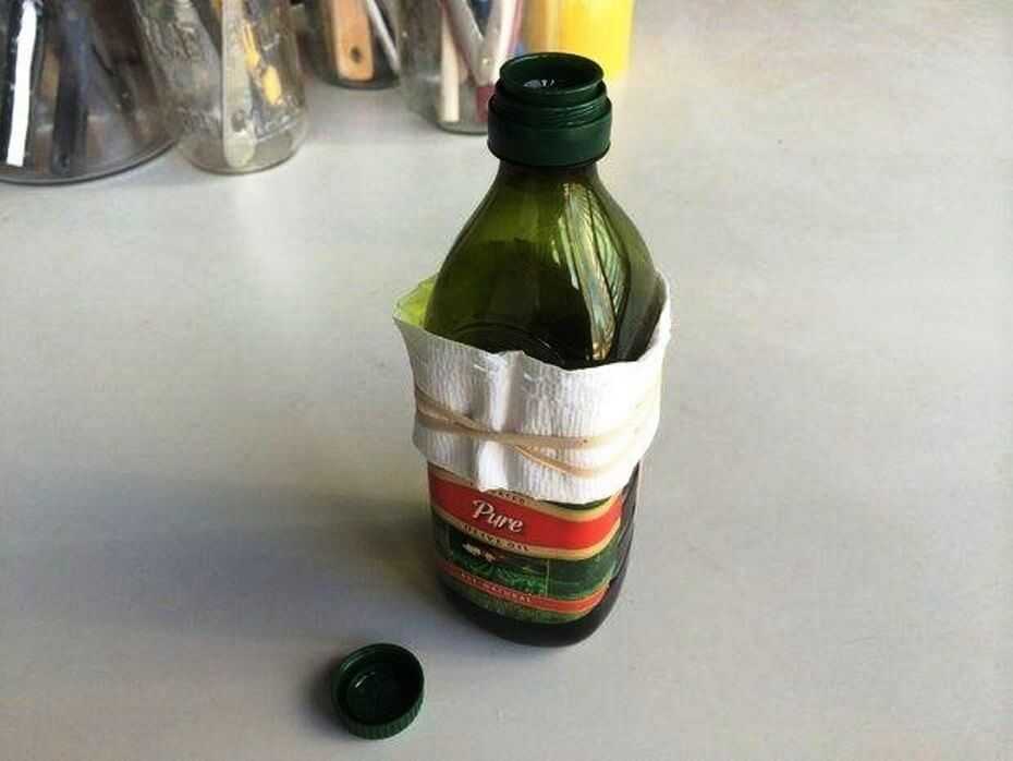Часто бывает так, что при наливании из бутылки какой-либо жидкости, предательская капелька стекает с горлышка по стенкам сосуда. Чтобы не испачкать руки и скатерть такой бутылкой можно обернуть ее бумажной салфеткой. Так часто делают самилье в ресторанах. Для простого кулинарного применения достаточно зафиксировать салфетку тонкой резинкой. Бумага будет впитывать излишки жидкости, например, масла и оно не будет капать на стол или скатерть.