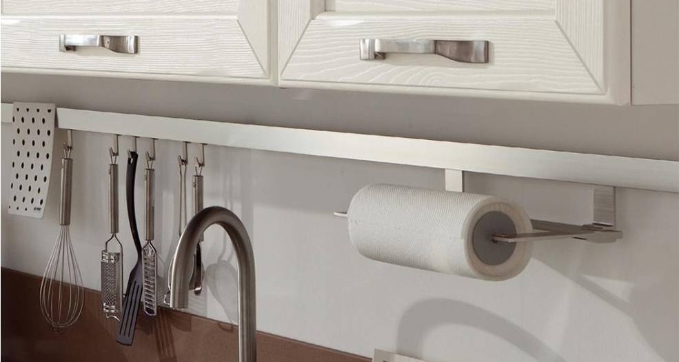И еще один метод закрепления держателя для бумажных полотенец – на рейлинге. Этот вариант устроит тех хозяек, на чьей кухне уже есть навесной металлический стержень. С помощью крючков на нем легко зафиксировать всевозможные полочки и прочие приспособления.