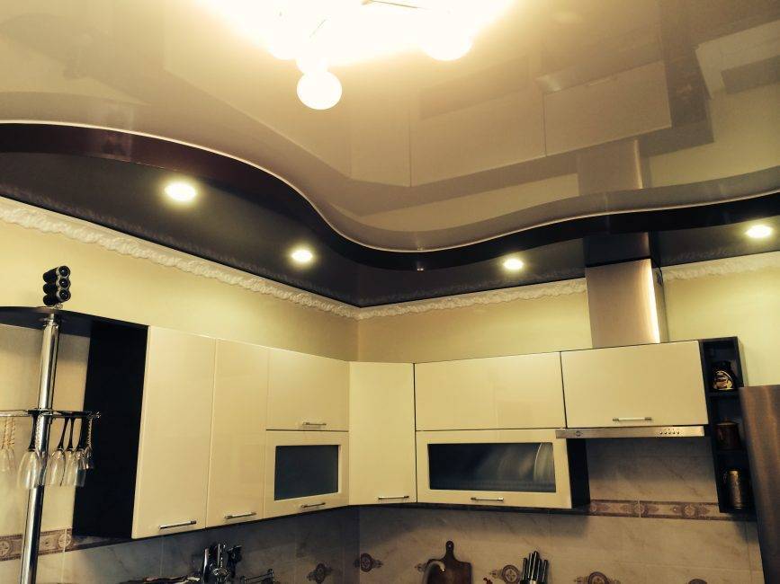 Бежево-черный потолок смотрится достаточно строго, однако выглядит оригинальнее привычного комбинирования черного с белым. Подобрать мебель к такому покрытию будет несложно, а внешний вид однозначно достоин высокой оценки.