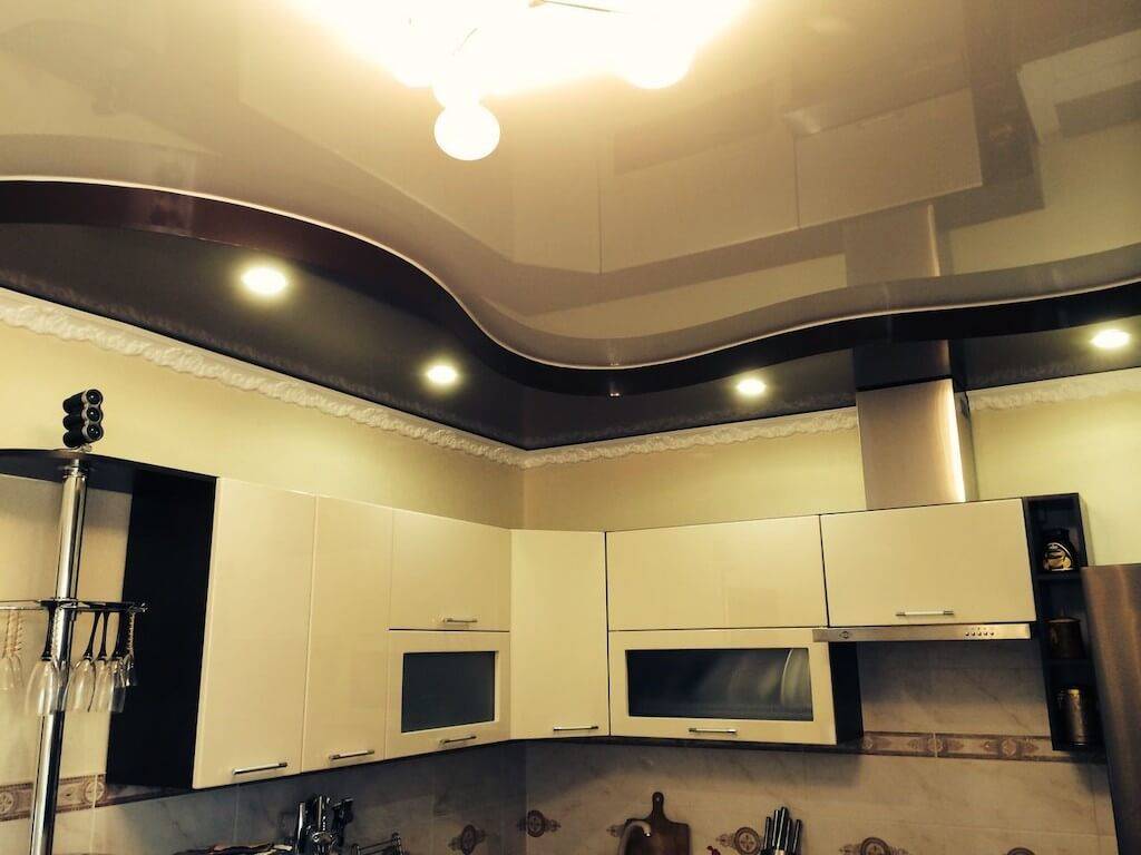 Также натяжные потолки защищают кухню от потопа, ведь материал выдерживает до 100 л жидкости на квадратный метр. После откачки воды конструкция принимает прежнюю форму, сохраняя безупречность очертаний.