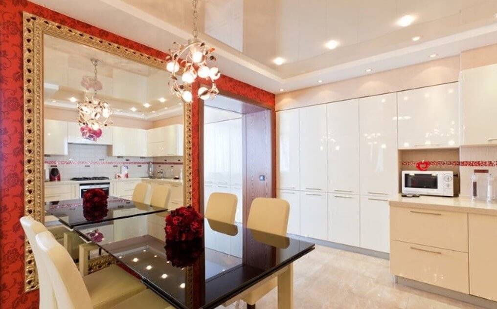 - зеркально-глянцевые натяжные полотна, возможно – в сочетании с матовыми по периметру;