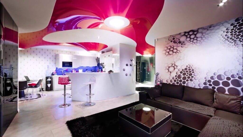 Однотонные конструкции или одиночный выразительный акцент на потолке, прекрасно впишутся в смелый и креативный хай-тек.