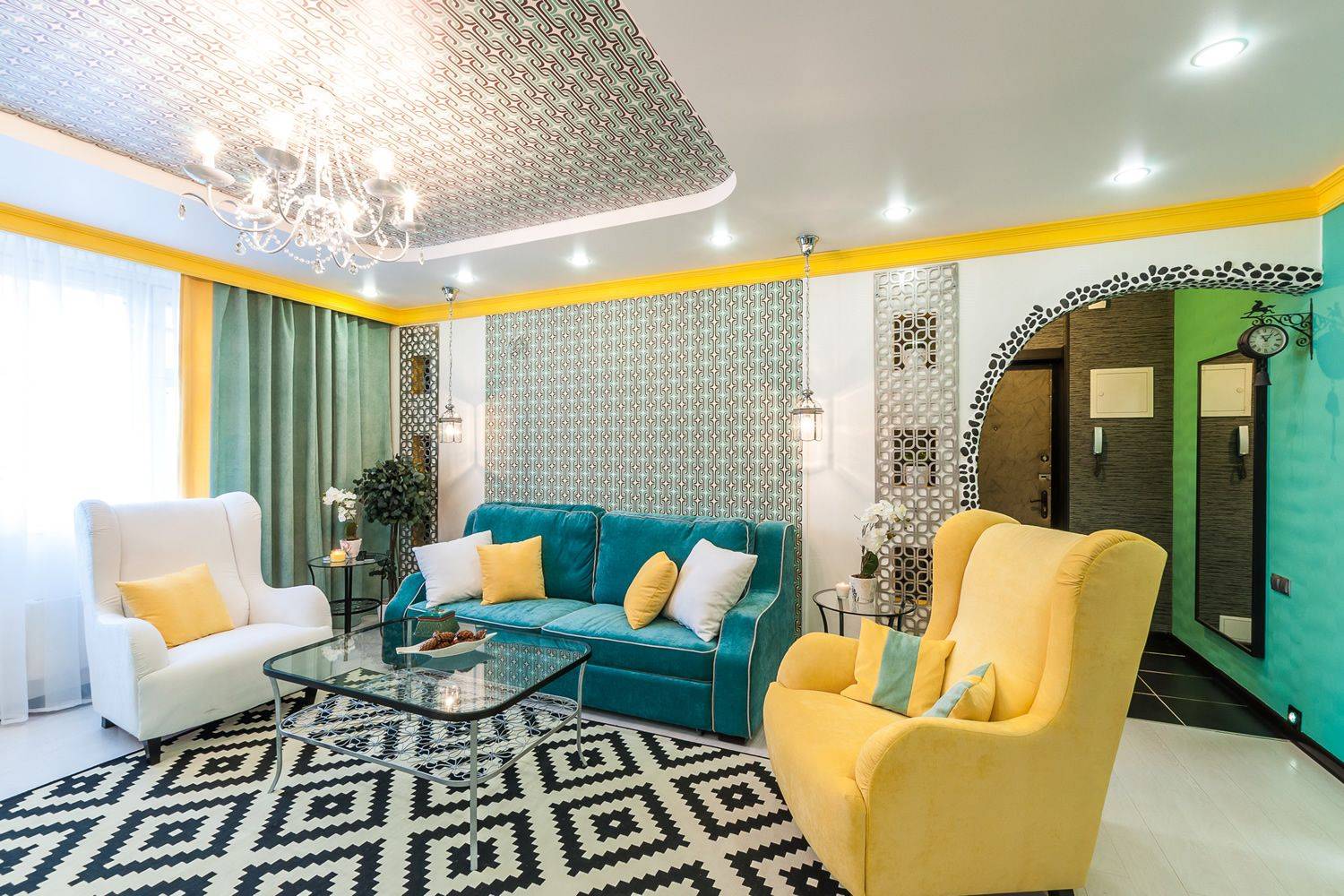 Зеленый цвет расслабляет и дарит покой. Это хорошее решение для отделки потолка спальни и зала. Яркая зелень добавит ощущение лета и энергии вместе с желтыми шторами и ковриком.