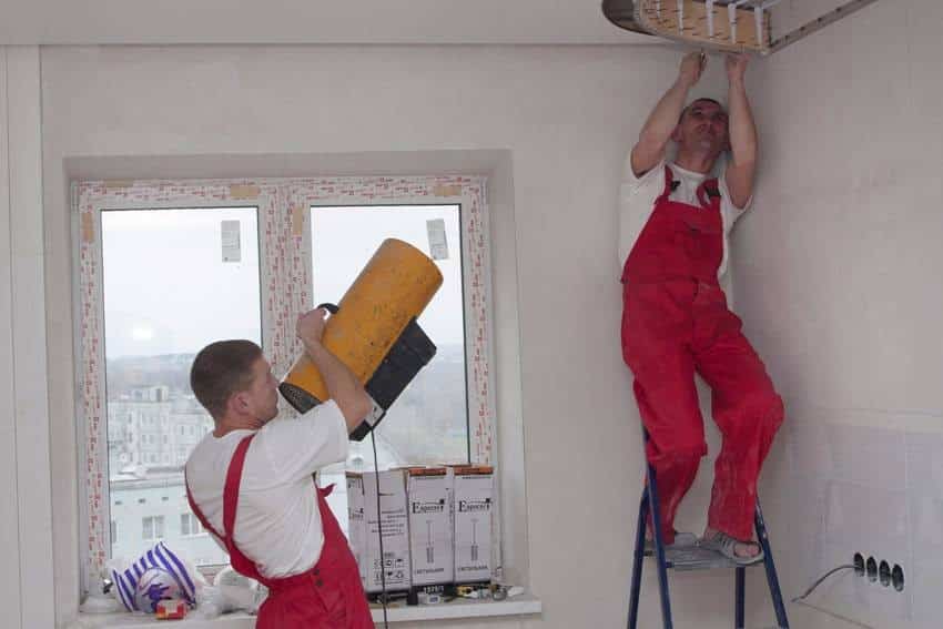 Поэтому, для установки ПВХ-полотен применяется специальный инструмент — тепловая пушка. Перед тем, как снять натяжной потолок, следует позаботиться о ее приобретении. Для разовой акции покупать ее нет смысла, а взять в аренду вполне разумно и доступно. Тепловая пушка понадобится, как для демонтажа полотна, так и для его установки на место.