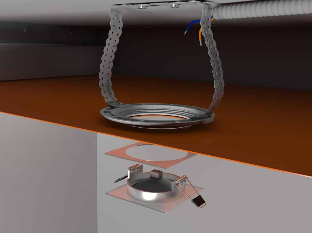 На самом полотне наносится разметка, по которой потом будут устанавливаться светильники. Изготавливаются кольца из пластика и позволяют без повреждений вырезать круг под плафон на полотне. Сквозь отверстие протягиваются провода, и устанавливается освещение. Неровные края перекрываются декоративными бортиками кольца. Перед началом демонтажных работ следует обесточить используемое помещение. Только после этого можно начать выкручивать лампочки. Для того, чтобы изъять точечные светильники, понадобится тупой предмет, при помощи которого следует отогнуть края планки.