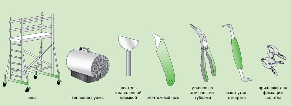Перед тем как самостоятельно снять натяжной потолок, необходимо подготовить специальные инструменты, которые вам понадобятся в процессе работы.