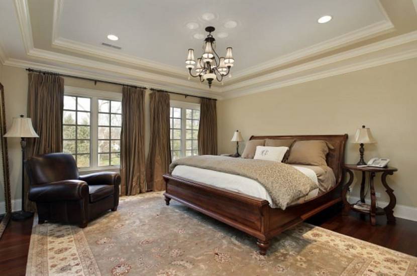 Многие боятся применить в спальне нестандартные цветовые решения для потолков, отдавая предпочтение белому цвету. Современные материалы позволят обыграть любую гамму оттенков. Темный потолок лучше оставить для просторных спален. Насыщенные вариации шоколадно-коричневого, бордовый, малахитовый, фиолетовый и глубокий синий придадут уют и комфорт вашей комнате отдыха.