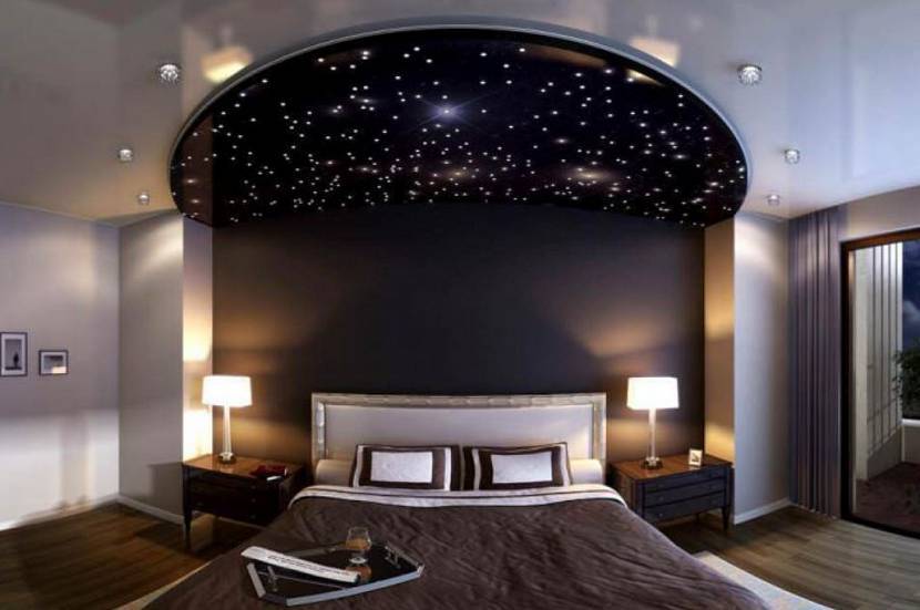 Звёздное небо. Эффект ночного небосвода достигается монтажом нескольких точечных светильников, расположенных внутри (между натяжным и основным потолками). Многочисленные отверстия в материи будут пропускать свет, создавая нужный эффект.
