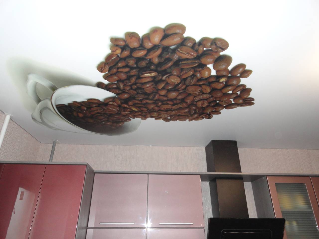 Здесь применимы натяжные потолки с объемной печатью. Популярны узоры, небо и цветы. Если рисунок хорошо воспринимается на лаковой поверхности, закажите именно глянцевое полотно. Это облегчит уборку будущего потолка от копоти и налета жира. Перфорированные и объемные конструкции противопоказаны. Можете устанавливать такие потолки только в том случае, если не планируете на кухне готовить еду.
