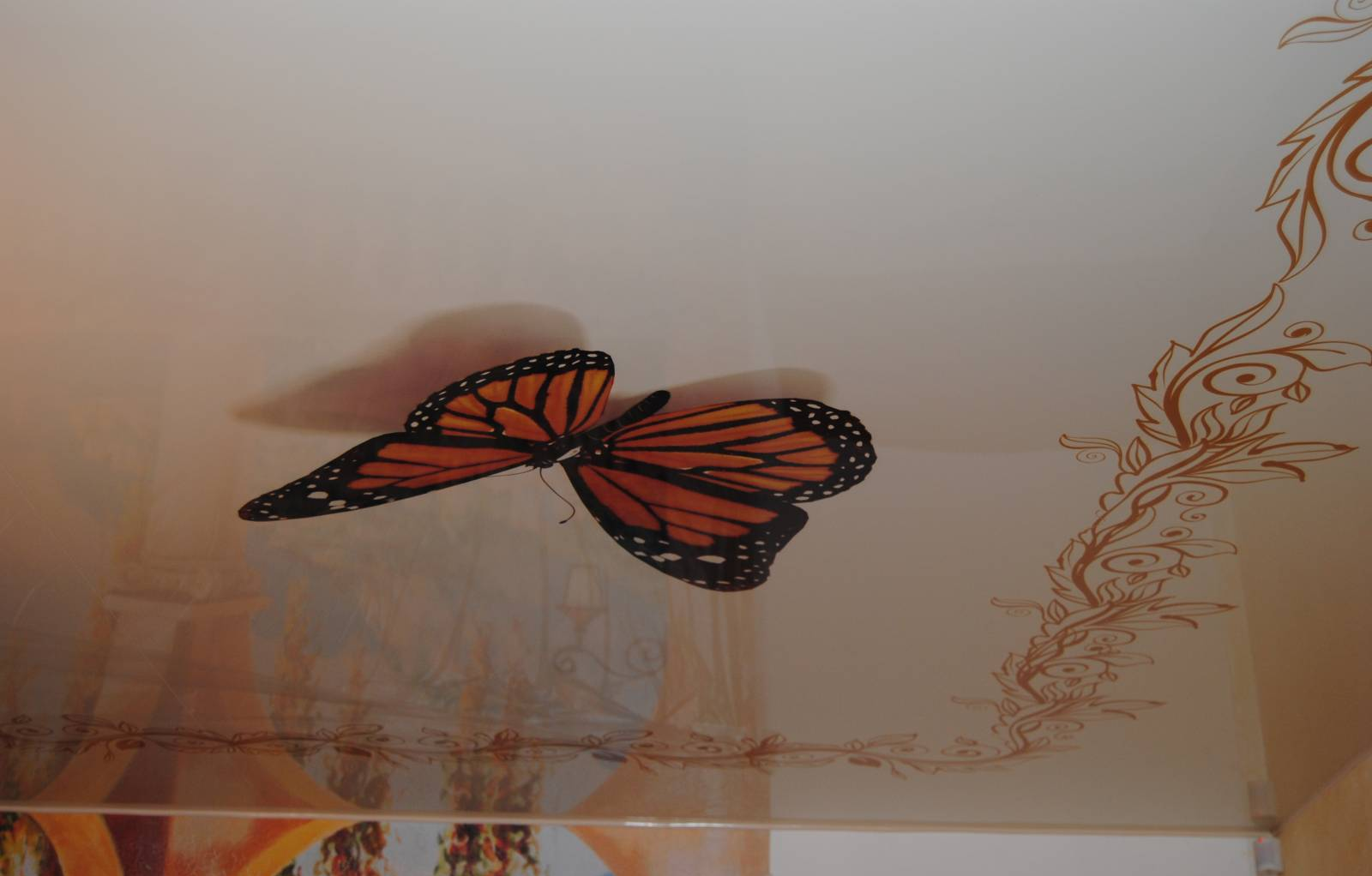 Используются разные комбинации цветов на одном потолке, где один оттенок плавно переходит в другой, и если на этот фон поместить, например, изображение птиц, создастся удивительный эффект движения. Вы будете ощущать над своей головой парение райских птиц и т.д.