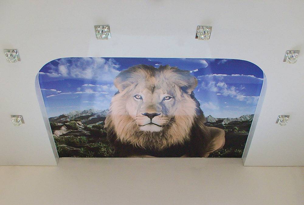 Тем, кто хочет подчеркнуть этнический дизайн, нравится украшать потолок изображением животных. Однако такой прием сложен, особенно если размер фотопечати большой. Так создается ощущение тяжести и давления, что отражается на настроении и самочувствии.