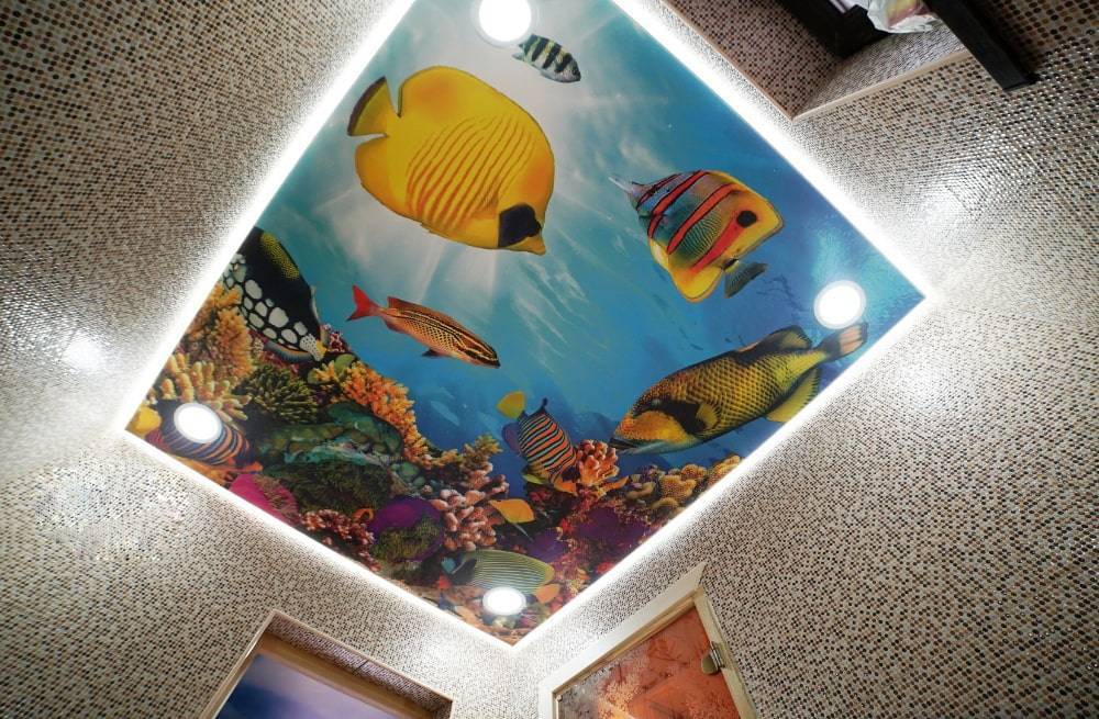 На фото потолок с 3д фотопечатью, имитирующей аквариум.