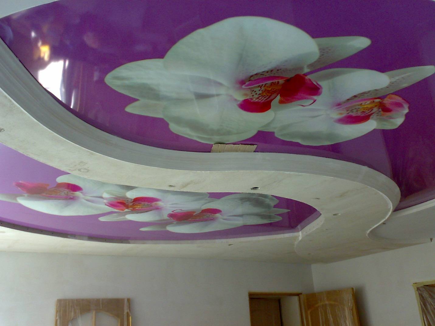 * двухуровневые натяжные потолки с фотопечатью, где изображение зачастую наносится на центральный верхний уровень