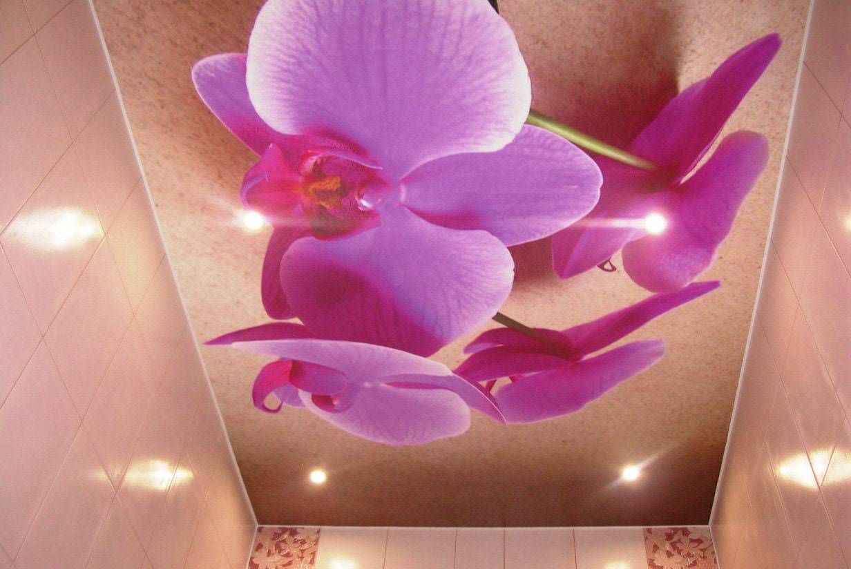 Красивые и яркие объемные соцветия орхидей, роз, сирени, лилий и других цветов в 3d натяжном потолке, сделают помещение свежим и необычайно уютным.