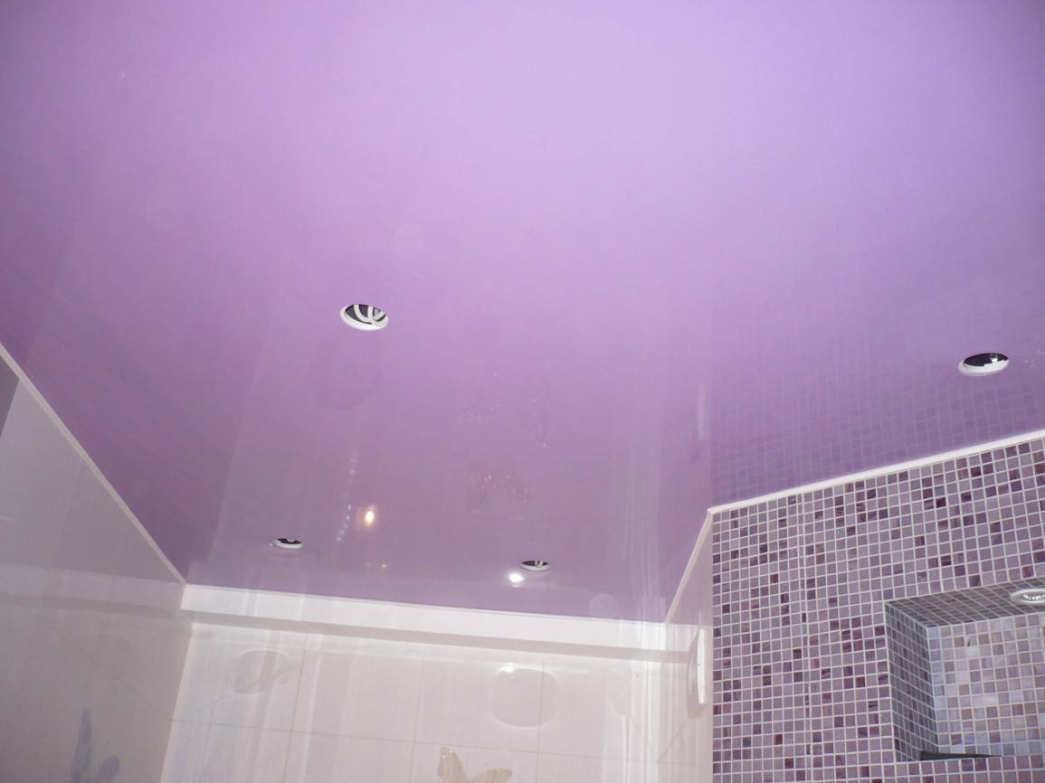 Глянцевое полотно визуально увеличивает комнату, что идеально для маленького помещения. К недостаткам можно отнести то, что на такой поверхности более заметны разводы и загрязнения. Поверхность потолка в ванной комнате придется очищать ежедневно, используя специальные средства.