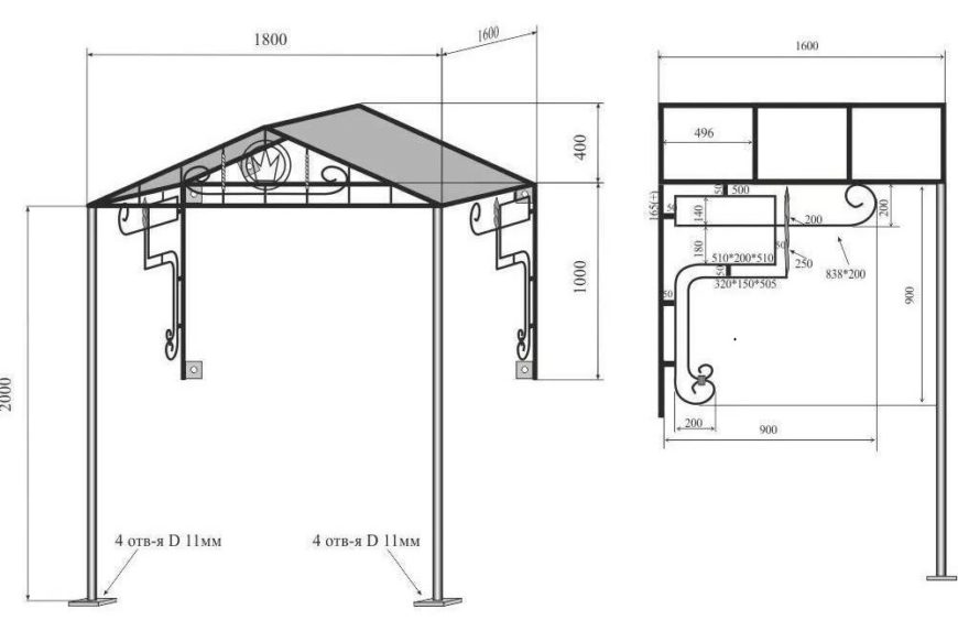 Работа с металлом требует навыков резки и сварки деталей. При наличии умений работать с оборудованием для холодной ковки навес можно украсить металлическим ажуром.