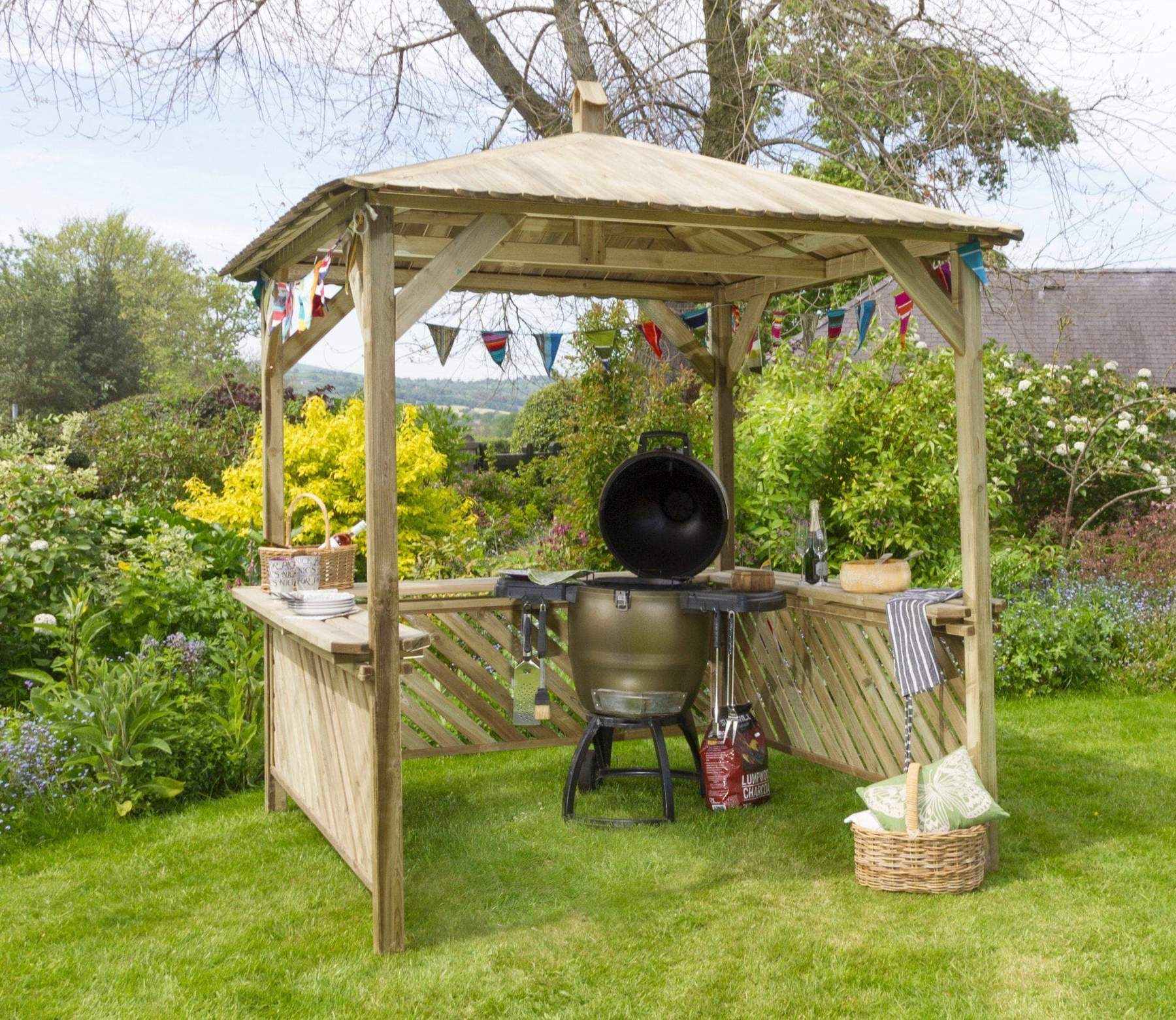 Если постройка будет закрывать часть зоны отдыха, опорные элементы можно изготовить из дерева, пропитанного огнезащитным составом. Расстояние от мангала до деревянных частей не должно быть меньше 1,5 м, поэтому минимальный размер деревянной конструкции составляет примерно 3х4 м. Негорючие детали могут располагаться на любом удобном расстоянии от жаровни.