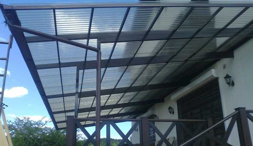 Кровельная конструкция монтируется на предварительно созданную обрешетку из металла, бруса. Вначале на опоры укладывают самые длинные горизонтальные балки или трубы, после к ним прикручиваются, прибиваются, привариваются поперечные перекладины, наклонные части. Небольшой навес накрывают одним-двумя листами материала, для более крупных количество элементов превышает 6-12.