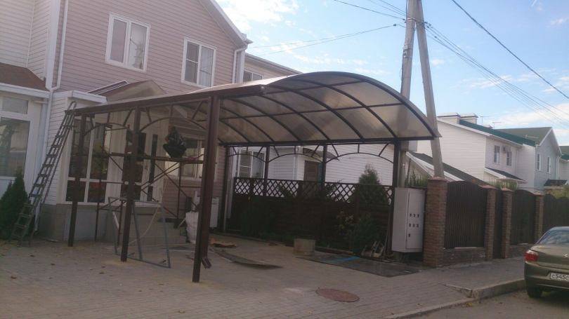 Варианты навесов из поликарбоната могут быть самыми разнообразными, но по факту любой навес крайне прост по своей сути, т. к. это опорные балки, подпирающие крышу, из выбранного материала.
