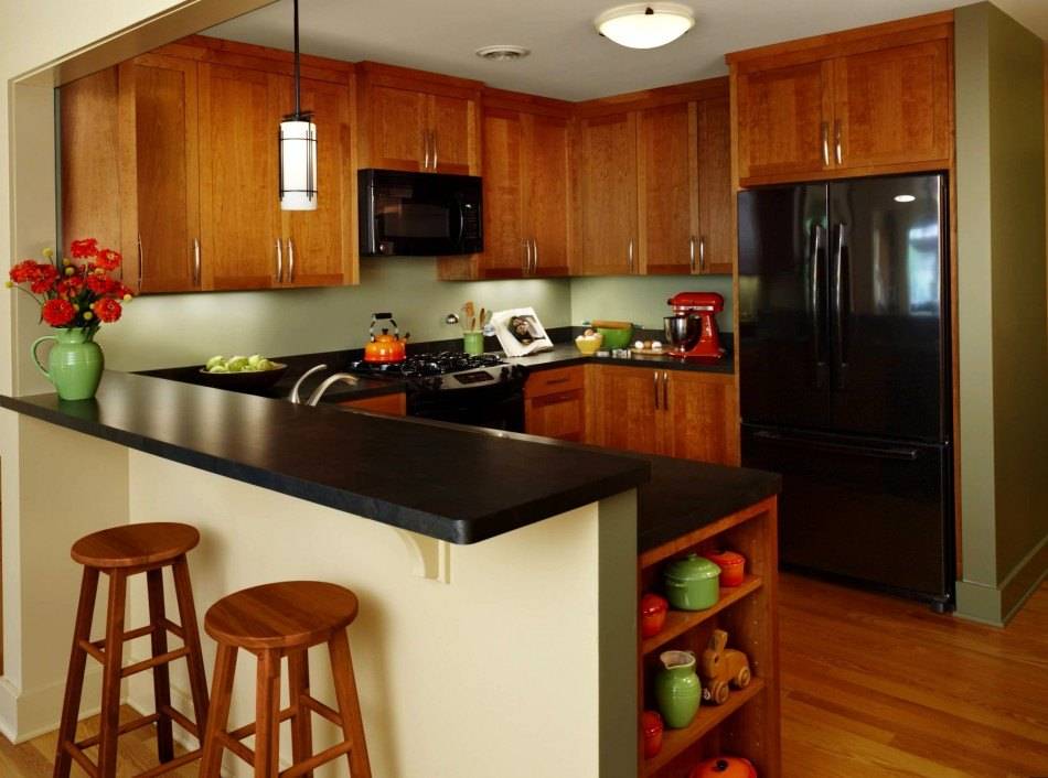 Темный для кухни будет выгоден тем, что на нем менее видны различные загрязнения. Выбрав темные оттенки для проекта п-образной кухни, вы несколько отступите от стереотипов и создадите современный дизайн, ведь в последнее время наблюдается тенденция преобладания темных тонов в оформлении жилого помещения. Если вы готовы к таким преобразованиям, смело действуйте.