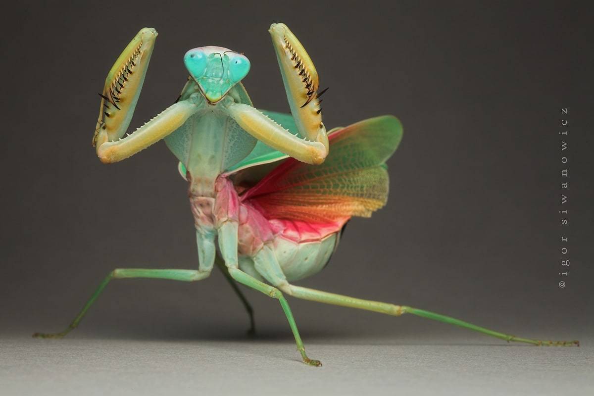 Фото богомола: Blepharopsis mendica, чертополоховый богомол. Спокойные и неагрессивные, эти богомолы редко вступают в схватку с кем-то, больше их по размеру. Лишь пытаясь напугать врага, они принимают угрожающую позу, расправив крылья и демонстрируя яркие участки туловища.