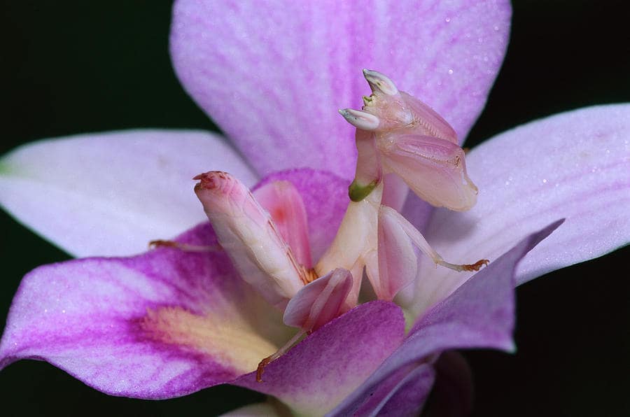 Фото богомола: Hymenopus coronatus, орхидейный богомол. Обладает дивным перламутровым окрасом, маскирующим его под место обитания — цветки орхидеи. Самцы этого вида почти в два раза меньше самок.